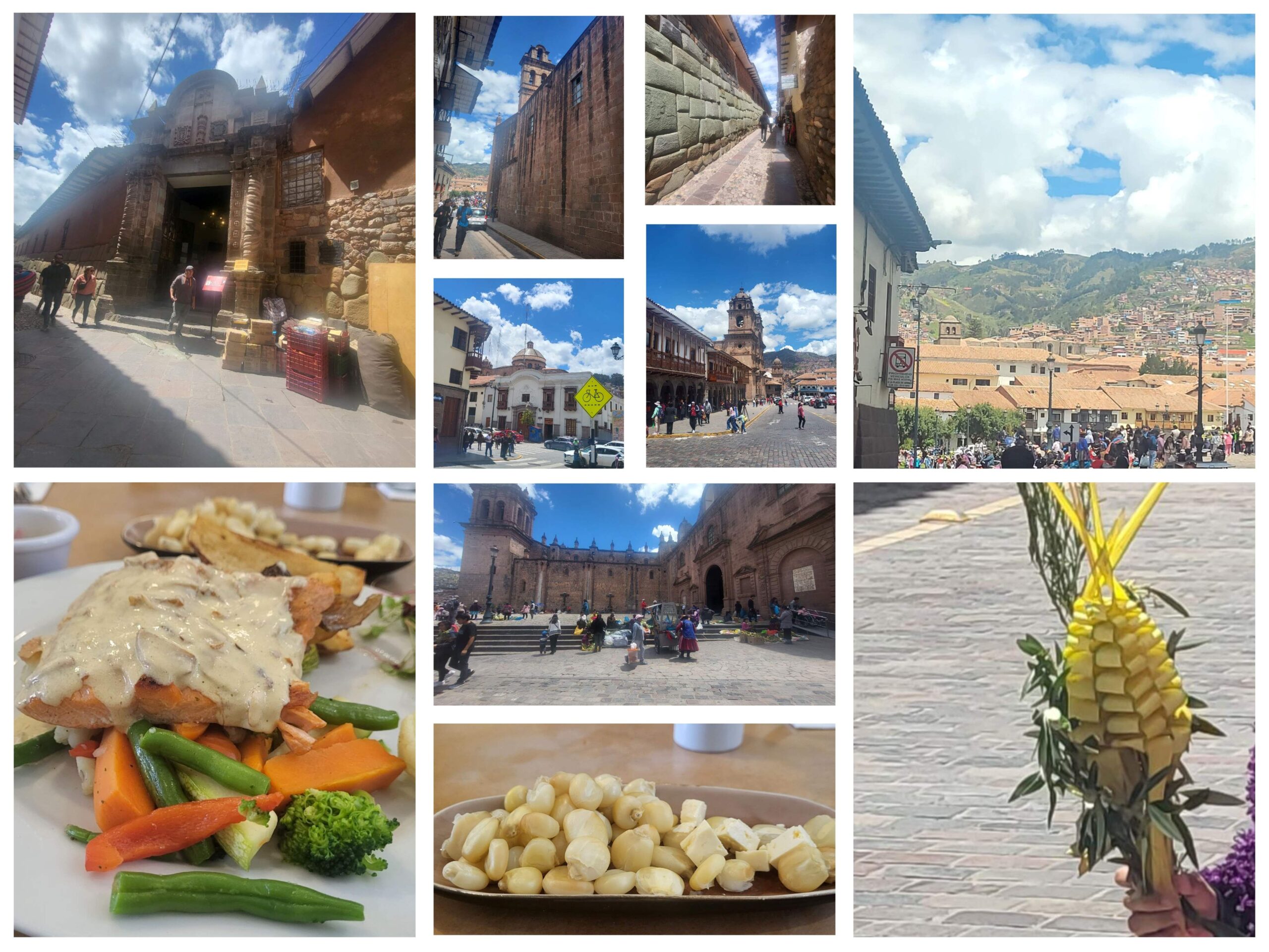 De ochtend gestart langs de 12 angled step. Deze legendarische stenen zouden de structuur zijn waarop de oude Inca paleizen gesteund hebben. Heel lang rustig kijken is er niet bij want de marktkraampjes in deze steeg zijn uitgestald en iedereen wil je iets verkopen. Aan het einde van de steeg ligt één van de vele kerken Palacio Arzobispal del Cuzco die Cusco bezit. De plaza d'arma is mega druk vanochtend en op de trappen worden er driftig bloemen gevouwen van planten. Het is geen doorsnee zondag het is de zondag naar aanloop van Pasen en de festiviteiten beginnen hier vandaag al en dus loopt meer dan 1:2 van de mensen tegen 12 met bloemen en een kruis over straat druk onderweg om die in één van de vele kerken te laten zegenen en mee naar huis te nemen. Het pinnen van cash is ook een gewaarwording een rij van dik 10 minuten bij 6 pinautomaten. Na de hoogte ziekte van de afgelopen dagen die gelukkig steeds minder wordt vandaag ook voor het eerst gewaagd aan het Peruaanse eten. Struinend langs de marktjes en winkels nog een paar laatste inkopen voor de trail van morgen en dan nu inpakken wat neem ik mee en wat blijft hier in het hotel en daarna naar de briefing voor het vertrek van morgenochtend. Hoe het internet onderweg op de trail van lodge naar lodge gaat zijn geen idee, dus wellicht enkele dagen geduld tot het volgende verslag.