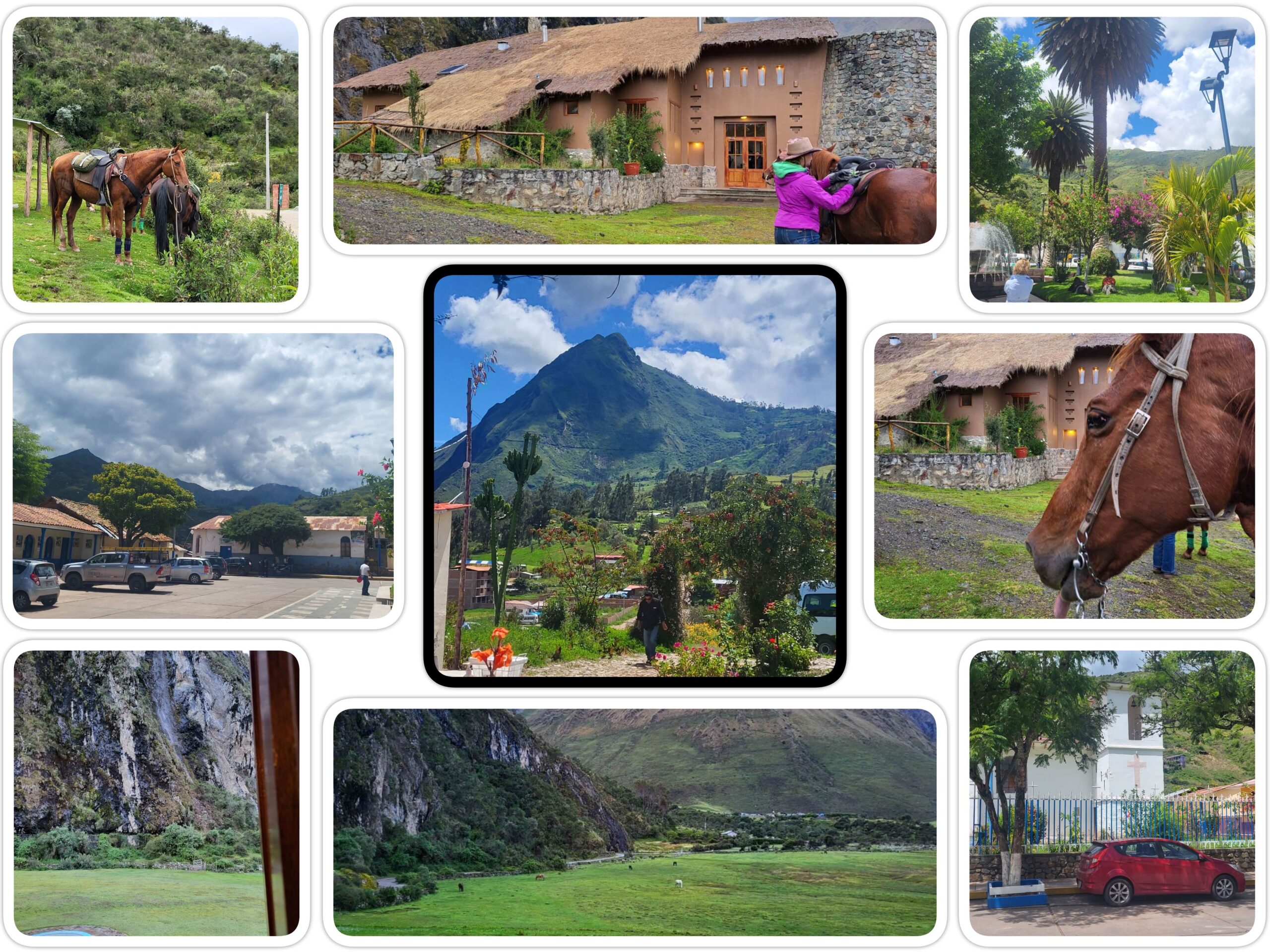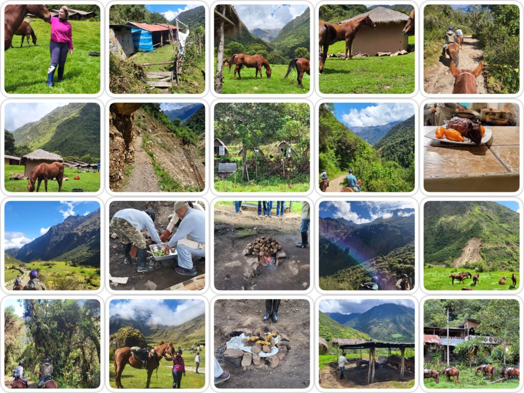 Vanochtend was de mist opgetrokken en konden we bij heldere lucht en een zonnetje lodge nummer twee verlaten. In drie uur tijd zijn we vandaag van 3800 meter gedaald naar 2700 meter. Met het mooie weer kon ik eindelijk de dikke lang winterjas en regen rijbroek uitlaten en de nieuwe SGC blauwe grip legging aan 🥰 De hele trail liep langs de route af waar de grote lawine was in 2019 en de schade was goed zichtbaar. Onze gidsen waren iets wat gespannen vandaag daar de trail altijd al smal was langs het ravijn maar na de lawine nog smaller geworden is. We zijn de eerste groep die de trail nu te paard weer doet nadat de boel in de wintermaanden dicht was en daarna door de protesten niet konden opstarten in maart zoals gebruikelijk. De eerste stop was bij een kleine boerderij daarna gingen we weer verder over de trail die steeds smaller werd totdat we een stukje eraf moesten (foto 16) als ruiters werden we te voet erover geleid en de grooms leidde de paarden over de trail. Een extra uitdaging is op deze trails de tegemoet komende muildieren en ezels. De gidsen blijven de hele trail keep left roepen dat wij in ieder geval niet aan de ravijn kant zijn. Als we willen starten aan het stuk te voet roept de gids die eerst vooruit gelopen was mules coming en dus konden we nog net een stukje terug en aan de kant blijven staan voor de muildieren die in grote vaart langs snelde. Nadat we weer opgestapt waren kwamen we al snel aan bij stop nummer twee een klein lokaal dorpje waar hikers kunnen slapen eten en WiFi gebruiken. Kleine hutjes om te slapen maar droog in ieder geval (foto 11). Na de tweede stop was het niet ver meer naar de derde lodge die ook weer ontzettend mooi ligt maar wat een brug waar we over moesten 🙈 weet niet of mijn paarden thuis dat zouden doen 🤣 (filmpje 14 toen ik er zelf al overheen was en de trail nog steeds wel uitdagend was om even te filmen). Bij de lodge werden we gastvrij ontvangen met een lokaal medisch sapje en een warme doek om onze handen en gezicht te wassen. De paarden hebben hier lekker hoog gras en gingen direct rollen met zijn allen en gras eten. Niet veel later kwamen onze twee hikers aan met hun gids en gingen we getuige zijn van Pacha Manca een Peruaanse etensbereiding. In een kuil zijn stenen verwarmd deze worden aan de kant gedaan en dan gaan er drie soorten aardappelen in. Daarna volgen er hete stenen en worden de bonen en het vlees verpakt in aluminium folie ingelegd. Daarna volgen weer stenen en wordt er zoete aardappelen die op bananen lijken opgelegd dan natte dozen en wordt de boel met aarde begraven. 25 minuten blijft het liggen in deze kuil en kunnen we even opfrissen. Daarna snel weer naar buiten om de boel uitgegraven te zien worden. Onderdeel van het vlees is kip lam varken en cavia. Die laatste worden hier in grote getallen gefokt om te eten. Een geroosterd exemplaar zie enerlaatste foto. En nog geen 10 minuten later is het bidet (laatste foto) geopend. Aanbeveling van de chef is kip en cavia dus dat hebben we natuurlijk braaf gedaan. Cavia proeft als eend maar heeft veel botjes en weinig vlees. Ter afsluiting een shot Pisco (lokale sterke drank) volgens het gebruik hier is dat noodzakelijk na het eten van Cavia.