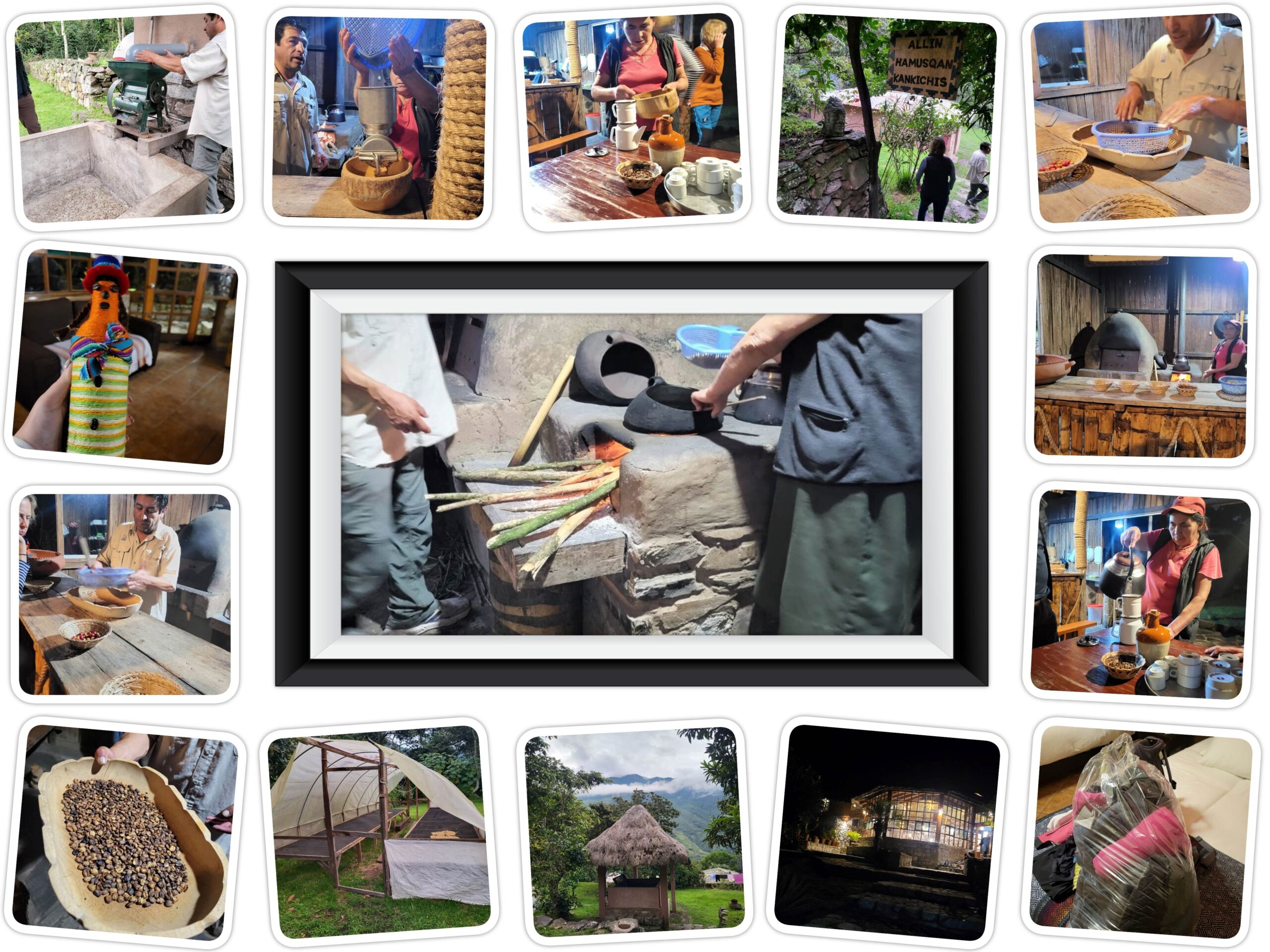 Vanavond zijn we naar een lokale koffie boerderij gegaan. Onderweg over de inca trail zagen we al de koffiebonen aan de planten. Op de boerderij het hele proces van plukken naar pellen naar drogen gezien en nog eens pellen. Daarna was het tijd om naar binnen te gaan en de bonen op het vuur te brengen. Elk stukje van het proces mochten we allemaal ook even roeren in de pan op het vuur en daarna de koffie malen. Daarna met water in de handmatige koffie machine kwam er espresso uit volgens de koffie drinkers in de groep heerlijk, maar deze latte machiato caramel drinker vond er natuurlijk weinig aan. Ook een lokale koffielikeur kon geproefd worden, echter vandaag goede vrijdag dus het proeven overgeslagen maar wel een grote fles gekocht die mooi Peruaans versierd is. Zo kunnen we thuis samen drinken en hebben Aiden en Layla daarna een mooi aandenken voor op hun kamer Bij terugkeer naar de lodge was het pikdonker echt niet te vergelijken met bij ons waar ik nog wel een keer zonder lamp een ronde ga rijden. De was vanmiddag om 14.00 ingeleverd was helemaal gedaan en dan nu inpakken voor de hike van morgen.