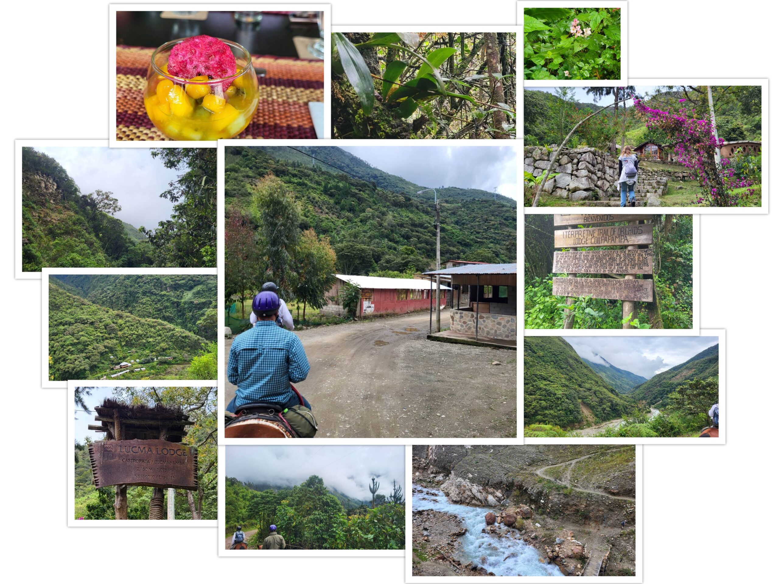 Vanochtend zijn we gestart met een korte hike rond onze lodge in de cloud forrest. Er is een kleine botanische tuin aangelegd om zeldzame orchideeën te kweken. Sommige bloeien maar enkele weken per jaar en wij hebben het geluk dat een aantal zeldzame exemplaren nu net uitkomen. Daarna staan de paarden klaar voor vertrek maar vannacht is er hevige regen geweest en dus gaan we het eerste stuk te voet in het kader van veiligheid. We gaan terug naar onder over de smalle route en de brug over. In filmpje 12 zie je hoe de paarden door drie grooms begeleid worden over de route. Vandaag dalen we verder van 2700 naar 2150 meter. Na de brug stappen we op en rijden we 18 km stap draf galop dit keer aangezien de bodem stukken beter is. We stoppen twee keer onderweg. Naar mate we dus dichterbij machu picchu komen (sinds vertrek vanochtend dus) hoe meer bewoning we ook aantreffen en ook meer groepen hikers. Uiteindelijk na 18 km bij de start van Inca trail van 12 km naar Machu Picchu stoppen we op een voetbalveld waar we afscheid nemen van de paarden. De paarden mogen tegenwoordig niet meer op deze trail ivm angst voor beschadiging van de trail. We gaan nog een kilometer te voet de berg op komen onderweg langs Starbucks en komen dan uit bij onze laatste lodge van deze reis. We worden weer opgewacht door vriendelijke staf met een doekje om onze handen en gezicht te wassen en een heerlijke verse appelsap. Kort na ons komen de hikers ook weer aan die natuurlijk morgen eindelijk ons het nakijken gaan geven als wij ook moeten lopen de laatste dag naar Machu Picchu. De Peruaanse keuken is fantastisch in iedere lodge en alles is organisch. De gerechten zijn aangepast op de ecologische omgeving en de producten die hier beschikbaar zijn of per muildier gebracht worden. Ook de ezels en muildieren hebben we afscheid van genomen. De bagage naar de lodge het laatste half uur wordt gedragen door lokale mannen. Nog even in de jacuzzi nu mentaal voorbereiden op de hike van morgen en dan vanavond gaan we een lokale koffie plantage bezoeken.