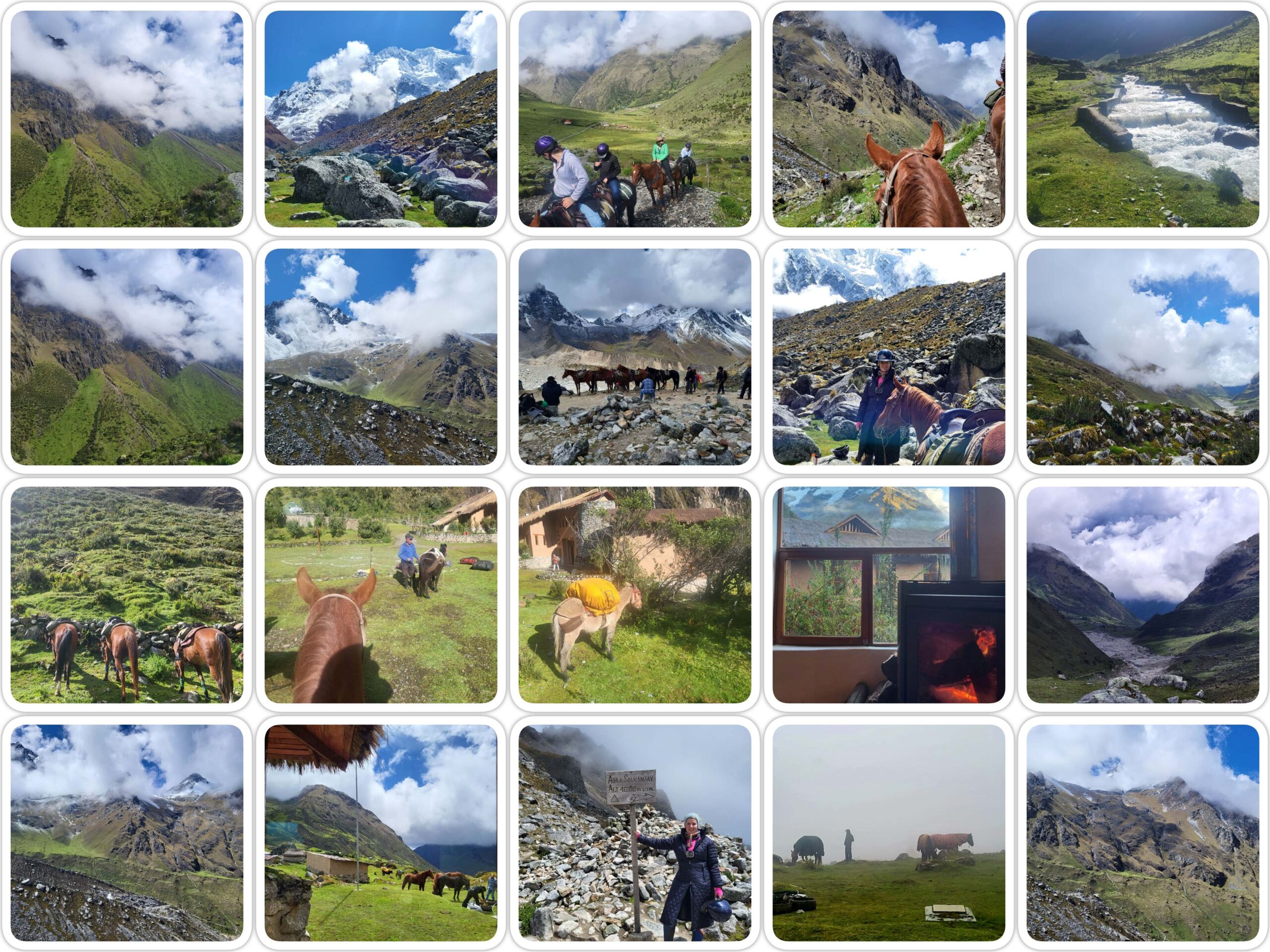 Gisteren na de trail in de vrije middag lekker in de jacuzzi met uitzicht op de gletsjer. In het begin van de avond werden we verrast met een Andes priester die een ritueel uitvoerde voor een goede en veilige reis over de Salkantay trail richting Machu Picchu en een heerlijk Peruaans diner volgde. Het eten in de lodge is uit de kunst. Alle lodges die wij bezoeken zijn van de organisatie Mountain lodges die deze 16 jaar geleden bouwde en één van de twee officiële vergunningen heeft om iets te mogen bouwen in deze omgeving. Vanochtend om 7 moest de bagage ingeleverd worden die vanaf nu per muildier of ezel vervoerd worden (foto 2 en 3 voor en na bepakking). Om 8 stond Fumine klaar voor vertrek op de zwaarste dag met een stijging van 3800 naar 4600. De 66 jarige dame met zuurstoftekort was al een uur eerder vertrokken met de arts en een persoonlijke groom en uiteraard zuurstof mee. De vergaande verzorging logistiek en service van de mensen van Mountain lodge is ongelooflijk. Het eerste deel van de rit was prachtig groen langs riviertjes en watervallen. De eerste pauze was ook aan een prachtige waterplek waar we even later onze bepakking met ezels en muildieren langs zagen komen. Even later kwam er nog een groep aan en die droegen eten van de paarden extra gas voor in de volgende lodge en andere benodigdheden. De begeleider had een jong muildier aan het touw mee om hem op te leiden. Die had echter geen zin om door het water te gaan en dus hielpen we even het eigenwijze diertje de weg te vervolgen. Kort daarna gingen we verder. Onze paarden deden het fantastisch als ik hier 5 meter over zulke stenen moet dan denk oh nee mijn paard gaat dadelijk kreupel 🙈 maar deze paarden doen het zonder blikken of blozen. De muildieren gaan echter nog veel sneller er overheen echt wonderbaarlijk om te zien hoe sterk deze muildieren en ezels zijn. We stoppen regelmatig om de paarden even op adem te laten komen en Fumine neemt dan vooral ook de tijd voor een kleine snack, het kastje moet branden immers. Hoe hoger we komen des te meer we in het maanlandschap terecht komen en dan komen we ook aan de top met een adembenemend uitzicht op 4600 meter na 625 meter klimmen in 6 km in 4 uur met pauzes. Daarna start de afdaling bij foto nummer 30 zijn de sporen van een grote lawine uit 2019 te zien een immense onverwachte Lawine die het leven nam van 18 mensen. Volgens de gids een geluk bij ongeluk dat dit in februari was buiten het hoogseizoen dat het aantal anders inmens geweest zou zijn. In de afdaling is de schade van de gletsjer goed te zien. Het dalen vond Fumine veel lastiger hij is groot met zijn 168 en heeft niet het compacte voordeel van de andere kleinere quarter horses maar hij komt er wel en als het dan eindelijk vlakker wordt zet hij met veel enthousiasme een galopje in naar de lodge. Daar komen we aan na een rijtijd van 5 uur en een uur pauze in totaal dus een tocht van een uur. Deze lodge net zo mooi als de vorige lodge en dit keer met uitzicht op de paarden 🥰